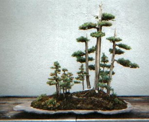 Forest planting by John Naka at the Japanese Pavilion entrance. Named "Goshin" (Protector of Spirit); 4 feet tall, 7 tree style planted by Mr. Naka in 1954. Foemina Juniper (Hari-Shimpaku) Juniperus chinensis var. foemina.